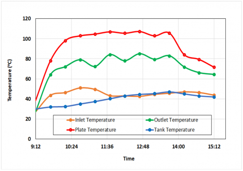 The absorber plate temperatures for original and modified systems for tilt angle of 31° are shown in Figure 4. As compared with modified system, the original system showed higher absorber plate temperatures trends throughout the day. The maximum plate temperature for original system was found to be 107.3℃, which was collected at noontime while for modified system it was 98℃. This was due to higher heat transfer rates associated with modified system.
