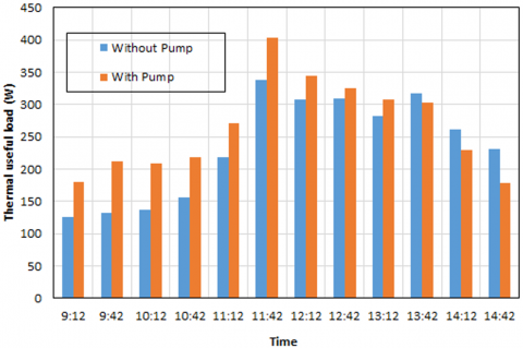 Figure 8 is a comparison of thermal useful load for original and modified system for tilt angle of 31°. As it can be seen from the figure, for most operating hours, the thermal useful load was higher for the modified system. The percentage increase in the thermal useful load for the modified system was ranging from 5% to 61%. It is very clear that higher percentage increase in the thermal useful load was found to be at morning hours. This is may be due to the combined effect of increasing of solar radiation for the collector and also for the solar panel which would affect in increasing of the amount of circulated water by the solar pump. A gradual reduction in the percentage increase in the thermal useful load was noticed after noon time and continued till a negative value were observed around 14:00 solar time, this also referred to the negative effect of the reduction of the amount of solar radiation on the system performance.