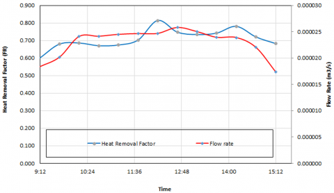 In all flat plate collectors, heat removal factor is very important parameter since it represents to which extent the available energy es transferred to the working fluid. Heat removal factor can be defined as the ratio of the amount of useful energy gained and the amount that would result if the absorbing plate surface of the collector had been at the same local fluid temperature. The collector heat removal factor was calculated based on Eq. (7) [1].