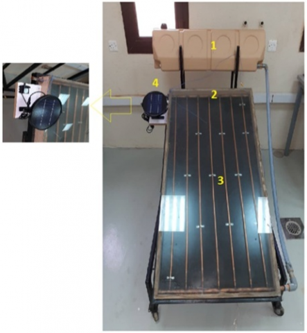 Figure 2. Modification that proposed to passive FPC available at Unaizah College of Engineering (1) Water tank (2) Header tubes (3) Riser tubes (4) Solar pump