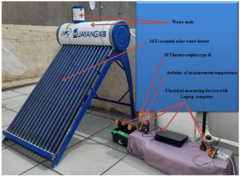 Integrates solar energy with a I possess a 200-litre storage tank and sixteen standard evacuated tubes. The SWH's stainless steel tank was constructed from a 0.9 mm thick sheet, while the evacuated tubes measured 6 cm in diameter, 4 cm in internal diameter, and 200 cm in length, all sourced from the local market. The double-layered cylindrical tank contains sixteen circular openings for the insertion of evacuated tubes. The SWH was equipped with the requisite instruments to collect the essential data, as depicted in Figure 1. Twenty K-type thermocouples were employed to measure temperature at designated sites, with an accuracy of ±0.1℃. To obtain an average temperature measurement, six thermocouples were immersed in the tank's water. The air temperature was assessed via a solitary thermocouple. The KHLMN1256 type, a precise solar radiation meter, was installed, capable of measuring solar radiation to within 2 W/m2. The digital measurements were acquired by combining a multipoint indication with the thermocouples. The Arduino Mega 2560 board incorporates an ATmega 2560 CPU. A total of 54 digital output/input pins are available, comprising 14 pins that generate PWM signals and 16 analogue inputs. All components on the board support the CPU. An external power supply or a USB port may be automatically selected to power the Arduino Mega. Alternative power sources to USB comprise batteries and adapters. Arduino may operate within a voltage range of 6 to V. The ATmega 2560 can store 256 KB of data. The 54 digital pins function as inputs or outputs, enabled by the pin mode capabilities of digital read and digital write. They operate at a voltage of five volts. Each port can provide or receive a maximum of 40 milliamperes, attributed to its integrated pull-up resistor. Furthermore, specific connectors fulfil distinct roles: The serial communication protocol functions to transmit (TX) and receive (RX) serial data. The USB connection is linked to port 0, while the serial chip is connected to port 1. These ports can be configured to initiate an external interrupt in response to a low-value situation, a falling or rising edge, or a change in value. Employ pulse width modulation (PWM) to produce an 8-bit output. The ports enable SPI communication. Digital pin 13 features an integrated LED. "I2C" denotes "communication using the Wire Library". The Mega2560 can accommodate 124,000 potential values through its sixteen analogue inputs, each featuring a ten-bit resolution. Analogue input reference voltage, abbreviated as AREF. Prior to resetting the microcontroller, the line must be configured to a low state. The Arduino Mega 2560 has many communication techniques with other Arduinos, PCs, or microcontrollers. Arduino features four UARTs for TTL serial communication. Arduino programming includes a serial monitor that enables the transfer of fundamental printed data to a PC. When information is transmitted from the PC using the ATmega8U2 chip and USB, the RX and TX LEDs on the board will light up and turn off. It is compatible with SPI and I2C protocols. The MAX6675 serves both as a cold-junction compensation device and as a converter that transforms the output signal of a K-type thermocouple into a digital format. The data is presented in a format compatible with SPI and is designated as read-only. The format's precision is 12 bits. This converter accommodates temperatures ranging from 0.25 degrees Celsius to 1024 degrees Celsius. The MAX6675 incorporates cold-junction correction, accounting for variations in the surrounding environmental temperature. The circuit converts ambient temperature data into voltage by utilising a temperature sensor diode. The MAX6675 determines the precise temperature of the thermocouple by analysing the voltage between its output and the sensor diode. The thermocouple detects voltage, reflecting the measured temperature, and subsequently converts this voltage through the ADC's conversion function. The following paragraphs will demonstrate that the calculations were conducted in accordance with the recommendations.