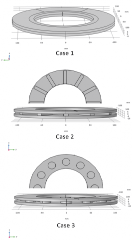 Figure 3. Tree forms of disc geometry: (case 1) solid disc, (case 2) vented disc with straight vanes, (case 3) vented disc with circular vanes