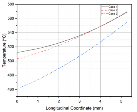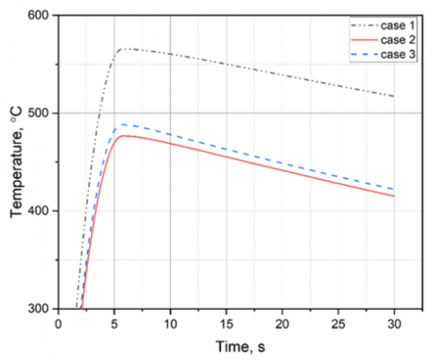 At time (t = 5.75 s) and in the axial symmetry plane of the disk, the average temperature varies from depth (Z = 0 mm) to depth (Z = 5 mm), ranging from a minimum value of 415℃ to a maximum temperature of 565℃ for the three test cases. The temperature evolution curves are shown in Figure 7.