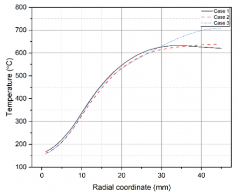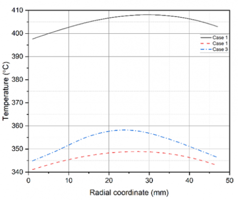It can be seen that at the edge of the disc (Rd) the temperature is slightly higher for the solid disc case (case 1) compared to the ventilated discs (case 2 and case 3), while inside the discs between radius rd and Rd the temperatures for the three test cases are similar.
