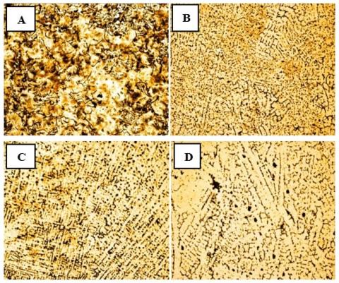 Figure 2. FC 200 gray cast iron as received base metal and weld metal microstructures: (A) gray cast iron base metal, (B) weld metal without preheating, (C) weld metal with 150℃ preheating, and (D) weld metal with 300℃ preheating