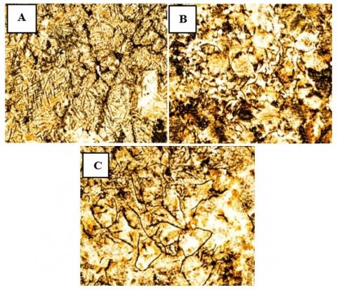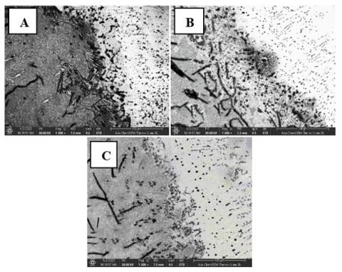 Figure 3. FC 200 gray cast iron HAZ microstructures: (A) without preheating, (B) HAZ with 150℃ preheating, and (C) HAZ with 300℃ preheating