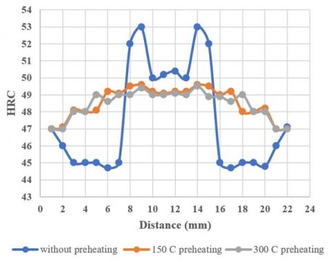 3. Preheating a weld to 150℃ produces better quality than non-heated samples but fails to eliminate the formation of carbides and residual stress. The weld shows diverse hardness patterns and contains some susceptibility to cracking.