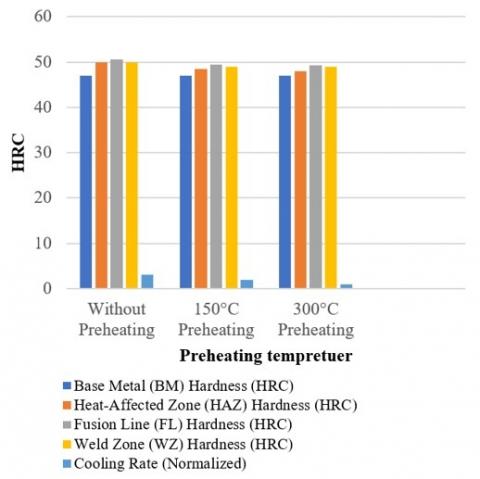 The hardness level at the fusion line reaches its peak due to carbide precipitation and rapid cooling at 50.5 HRC when preheating does not occur. The extreme embrittlement behavior in this area creates dangers regarding possible material fracture. The reduction of carbide precipitation through 150℃ preheating leads to less brittle material while decreasing the hardness to ~49.5 HRC. The hardness level at 300 degrees Celsius preheating amounts to ~49.3 HRC which provides better material ductility compared to non-preheated conditions. The material shows a smoother structure comprising reduced carbide formations. This present scenario demonstrates the best outcome for cracking prevention among all cases tested. The WZ's hardness measures around 50 HRC along with slight variations when preheating is absent. The material experiences significant internal stresses at this temperature range that may lead to cracking occurrence. This weldment displays the lowest internal stress and best ductility due to which it remains the most stable option. Table 10 summarized this comparison parameters.