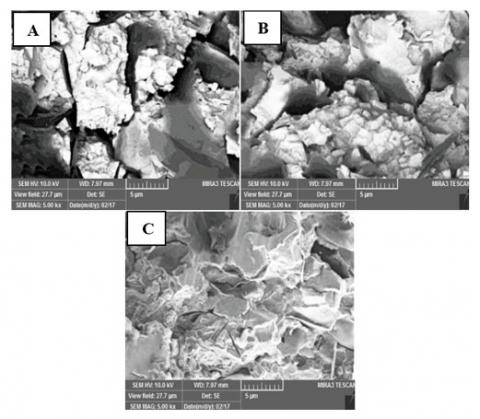 Figure 7. Tensile test fracture SEM: (A) without preheating, (B) 150℃ preheating, and (C) 300℃ preheating