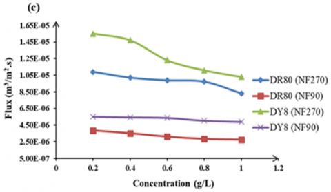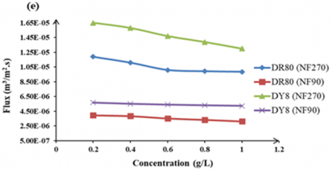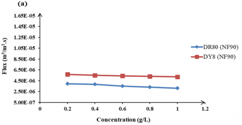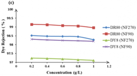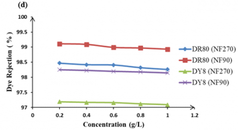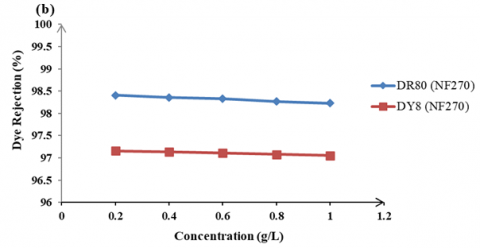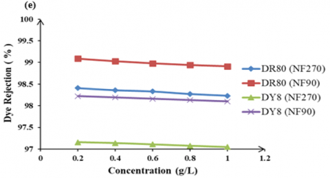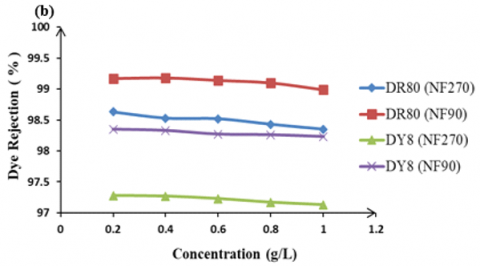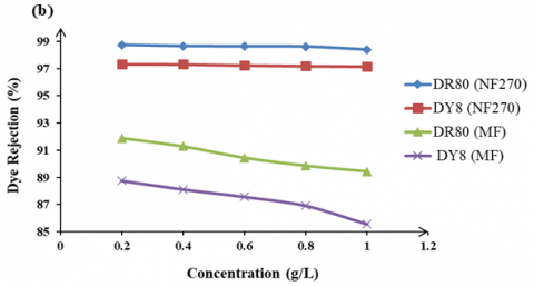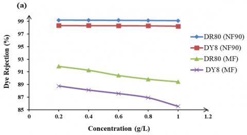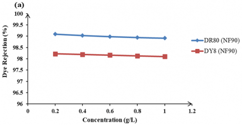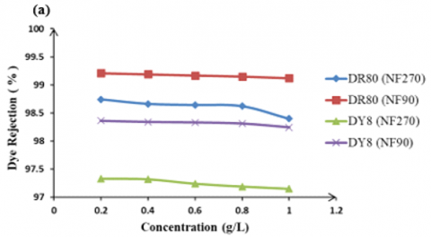 The influence of feed dye concentration on the dye rejection. Figure 10 shows the effect of feed dye concentration on the rejection of DR80 and DY8 using two types of NF membrane at fixed operating pressure.