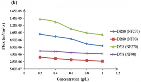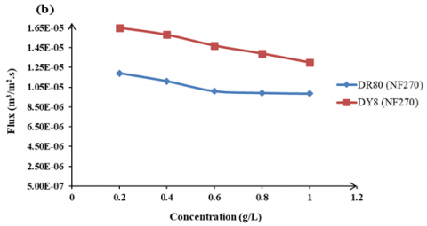 Figure 11. Effect of dye concentration (0.2–1.0 g/L) on permeate flux of DR80 and DY8 using (a) NF90 and (b) NF270 at 1000 kPa, pH 6 over 30 min