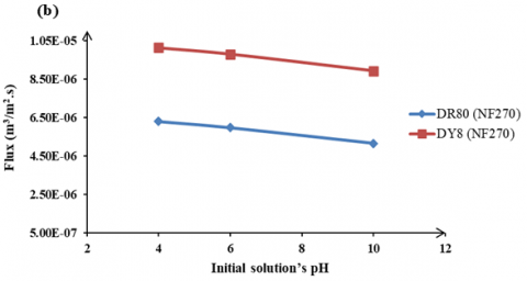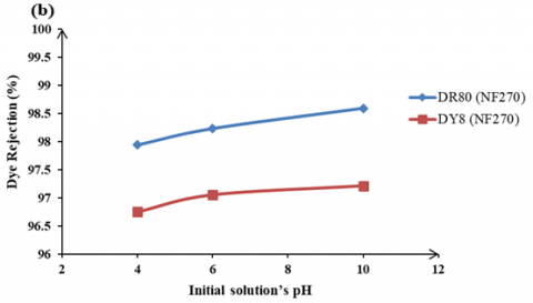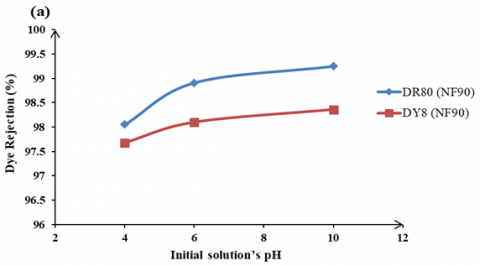 The influence of pH plays an important role in the removal of the dye by nanofiltration, as it affects the charge of the dye molecules and the characteristics of the membrane [21]. Figure 12 demonstrates the impact of the initial pH of the solution on dye rejection for two varieties of nanofiltration membranes, DR80 and DY8, while maintaining a constant operating pressure. Figure 12(a) illustrates that the dye rejection for DR80 rose from 98.05% to 99.25%, while for DY8, it increased from 97.68% to 98.36% as the initial solution's pH was elevated from 4 to 10 for NF90. Furthermore, it is evident in Figure 12(a) that the dye rejection for DR80 rose from 97.94% to 98.59%, while for DY8, it increased from 96.75% to 97.21% as the initial solution's pH was raised from 4 to 10 for NF270 [29] observed that increasing the pH of the initial dye solution resulted in increased dye removal.