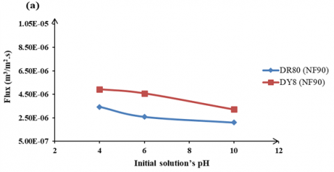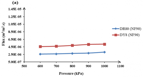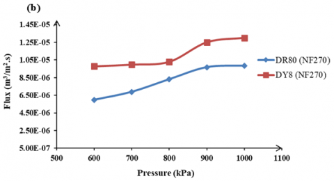 The influence of operating pressure on the permeates flux. Figure 9 shows the effect of operating pressure on the permeate flux of DR80 and DY8 using two types of NF membranes at fixed feed dye concentration.