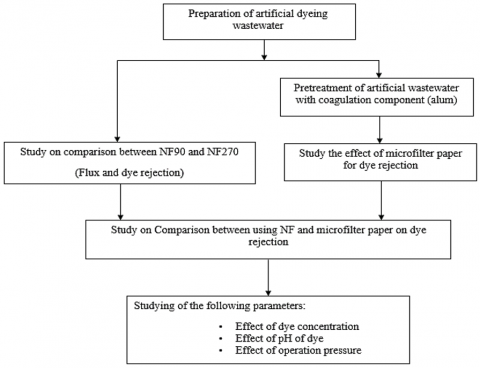 This study primarily investigates the removal of colour from textile wastewater through the use of NF membranes in controlled laboratory batch experiments. Figure 3 describes the flow chart of the comprehensive experiment conducted in this study.