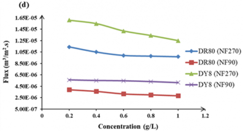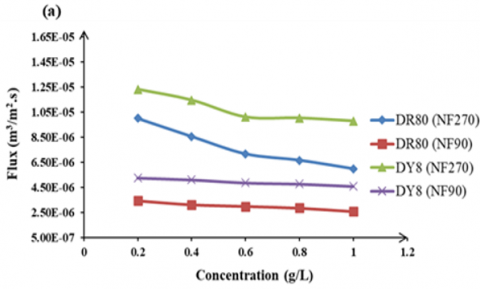 This study investigated the removal of 1.0 g/L of Direct Red 80 (DR80) and Direct Yellow 8 (DY8) from aqueous solutions through the application of the nanofiltration process (NF90 and NF270). In these experiments, five distinct concentrations of two dye types (DR80 and DY8) were selected.