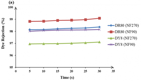 Figure 7. Dye rejection of DR80 and DY8 using (a) NF90 vs. microfilter and (b) NF270 vs. microfilter at 0.2–1.0 g/L, 1000 kPa, pH 6 over 30 min