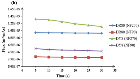 In nanofiltration membrane separation, concentration is a crucial factor. Generally, an increased concentration results in elevated osmotic pressure, hence reducing the permeate flux [24]. Figure 6(a) illustrates that the dye rejection rates for DR80 and DY8, when utilising both NF90 and NF270 membranes, show an increase over time. This enhancement is attributed to the formation of a fouling layer, which develops as dye is absorbed onto the membrane, thereby improving dye rejection efficiency. Conversely, Figure 6(b) illustrates that the permeate flux of DR80 and DY8, when utilising the two types of NF90 and NF270, decreased over time. This observation has also been documented by Chakraborty et al. [25]. This illustrates the variation in flow values over time under consistent concentrations of feed materials and operating pressures. The decline in permeate flow over the duration of operation is evident. This occurs as a result of concentration polarisation, resulting in heightened osmotic pressure at the membrane-solution interface and a reduction in effective driving forces (transmembrane pressure), ultimately causing a decrease in flow.