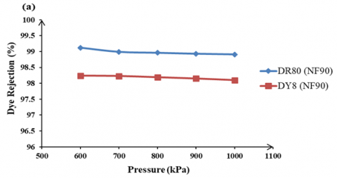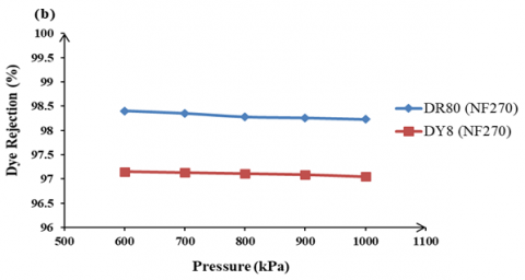 The influence of operating pressure on the dye rejection. Figure 8 describes the influence of operating pressure on the rejection of Direct Red 80 (DR80) and Direct Yellow 8 (DY8) dyes using two types of nanofiltration membranes (NF90 and NF270) at a fixed feed dye concentration of 1.0 g/L. A minor reduction in dye rejection is observed as the operating pressure increases for both membranes. Specifically, Figure 8(a) shows that for NF90, the rejection of DR80 and DY8 slightly decreased from 99.12% and 98.24% at 600 kPa to 98.99% and 98.23% at 700 kPa, respectively. Similarly, Figure 8(b) indicates that for NF270, the rejection of DR80 and DY8 declined from 98.4% and 97.15% at 600 kPa to 98.35% and 97.13% at 700 kPa, respectively.