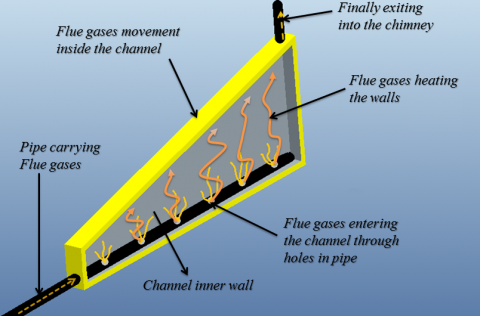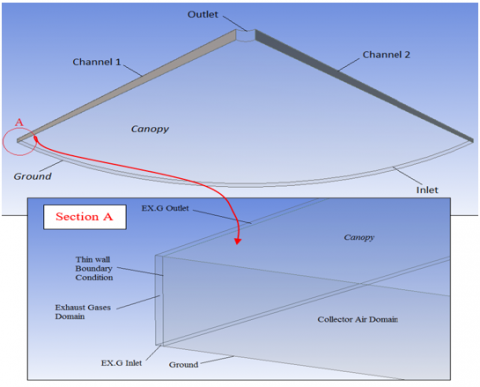 Hua and Leung [19] reported that the idea of utilizing industrial waste heat to enhance the performance of SCPP was initiated by the research team headed by Al-Kayiem at Universiti Teknologi PETRONAS - Malaysia. The computational analysis results have been reported by Al-Kayiem et al. [20] and Islamuddin et al. [21], the mathematical analysis by Islamuddin et al. [21], Chikere et al. [22, 23], and the experimental investigation results by Al-Kayiem et al. [20, 24] and Chikere et al. [23]. Their idea is to integrate the industrial TPP with the SCPP to mitigate the setbacks of low efficiency and night interruption in the SCPP operation. Significant findings have been reported from their elementary experimental and numerical works. Thermal data of the flue gas were adopted from 30 MW-level waste incineration in Guangdong province in China. They acquired 24/7 power production from the SCPP. A different approach by Lee [25] made it possible to link flue gases exhausted from a gas turbine power plant and the SCPP. An experimental model verified the effectiveness of the hybrid system by utilizing an inclined solar collector model that permits the flue gas to flow from the exit of an experimental gas turbine to underneath the solar absorber. Then after, the technique was modified by Chikere [26], where a biomass burner replaced the experimental gas turbine, the absorber was modified for double slopes, and the system was evaluated under various outdoor weather conditions. Jessam and Han [27] tested the system presented by Lee [25] in three different operational modes in a real outdoor environment but used a small biomass burner to produce the flue gas.