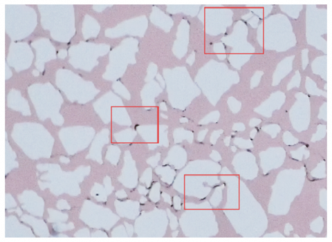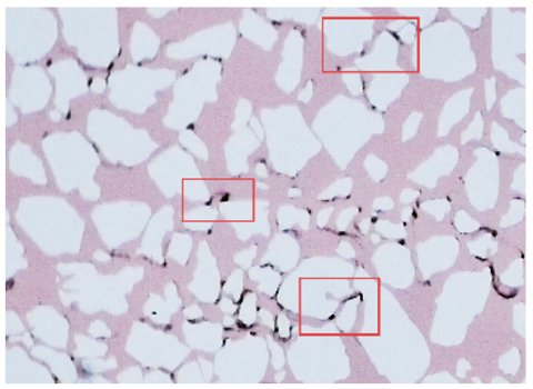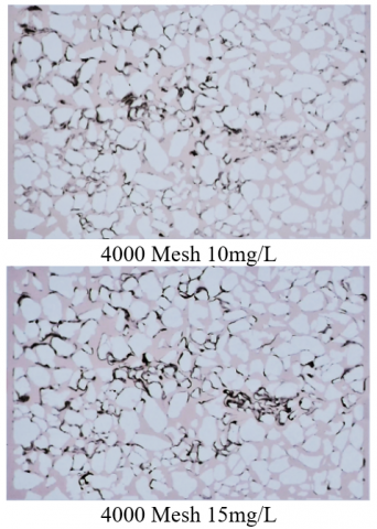 (2) 2000 Mesh Medium Particles (2.987 μm): These particles exhibit dynamic migration-retention equilibrium characteristics. With improved compatibility between particle size and pore throat, some particles can break through the front filtration zone and migrate further into the system, as shown in Figure 6(b). In this process, particles form multi-particle cooperative bridges at constriction points in the pore throats due to the combined effects of electrostatic forces and fluid shear forces. Over time, deep clogging develops in the porous medium. This clogging mode is spatially expansive, causing simultaneous pore blockage in different sections of the filtration system.