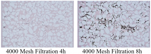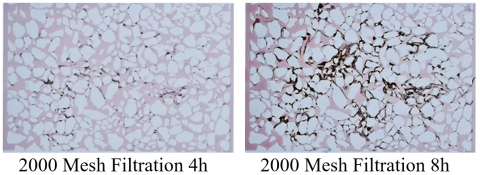 The large particle (800 Mesh) system shows pressure fluctuations at the initial stage of the experiment. This is because the filtration chip is pre-filled with dyed liquid during pre-treatment, and the liquid needs a certain initial driving force to begin filtering in the capillaries of the filtration pores. After this, the curve rises at a relatively steady rate, with a clear pressure inflection point marking the initial filtration point. In the 0-25 minute period, the initial filtration points for the 800 Mesh, 2000 Mesh, and 4000 Mesh experiments were 18 kPa, 16 kPa, and 22 kPa, respectively. As time progresses, after 4 hours, the pressures in all three experiments increase to 1.5 times the initial filtration point. After that, the slope of the pressure curve increases, and the pressure rises more rapidly due to clogging within the system, leading to reduced filtration permeability. At the end of the experiment, the pressure in the large particle system stabilizes, and the filtration clogging reaches stability. In contrast, the medium and small particle groups continue to experience rising pressure, exceeding 1.5 times the initial filtration point, indicating that filtration and clogging are still ongoing.