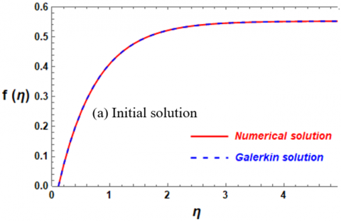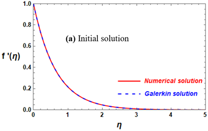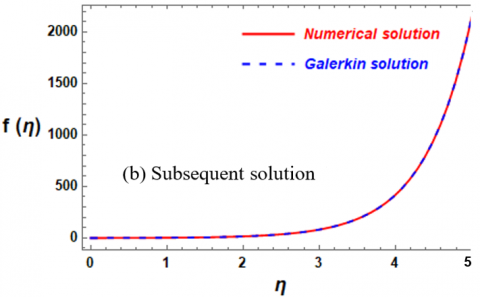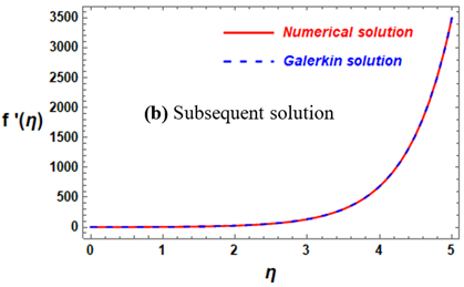 It is worth noting here that the system being dealt with represents a jerk model, which is a nonlinear differential equation. Therefore, it is difficult to obtain an exit solution, so we can conclude that our method maintains an error rate less than $X%$ that of numerical solutions. Although the accuracy of the analytical method used has been previously evaluated in numerous studies in the literature, this is the first time it has been used in such systems, where the boundary conditions contain infinity. Therefore, it was necessary to compare the solution obtained using Galerkin method with numerical solutions using the most reliable and common method for this type of problem, the shooting method. This is illustrated graphically in Figures 2(a), 2(b), 3(a), and 3(b). In addition, the error in the calculations between the numerical and analytical solutions is calculated in Tables 1 and 2 to demonstrate the extent of agreement between the results and provide confidence in the analytical method used for this type of fluid flow system. Figure 2(a) represents a comparison between the numerical and Galerkin initial solutions for the function $f\left( \eta \right)$. In this a (Galerkin) analytic solution (represented by the dashed blue line), whereas a numerical solution (represented by the solid red line). The solution $f\left( \eta \right)$ is represented on the vertical axis, spanning from 0 to above 0.6, in relation to the independent variable $\eta $ on the horizontal axis, which extends from 0 to 5. The great agreement between the Galerkin and Numerical solutions over the whole region of $\eta $ displayed is a remarkable aspect of this study. The answers are identical, as seen by the nearly perfect superimposition of the blue dashed line (Galerkin) and the red solid line (shooting). Furthermore, low $\eta $ Values ($\eta \simeq 0$ to $\eta \simeq 2$) are indicated by this diagram: The function f(η) shows a fast, non-linear exponential-like growth as $\eta $ grows, reaching values between 0 and 0.5 at $\eta \simeq 2$. The superposition of the two curves is preserved even in this area of significant amplitude and fast change. In the second case (subsequent solution), Figure 2(b) also shows a comparison between the numerical and the initial Galerkin solutions for the function $f\left( \eta \right)$. The vertical axis, which spans from 0 to over 2000, represents the function $f\left( \eta \right)$, while the horizontal axis, which spans from 0 to 5, represents the independent variable $\eta $. The function $f\left( \eta \right)$ exhibits rapid nonlinear growth with the growth of $\eta $. The high agreement between the Galerkin and numerical solutions, represented in blue and red, remains prominent throughout the entire range, even in this region of rapid change. Compared favorably to the numerical solution, this is an important observation that shows how accurate and robust the Galerkin approach is at capturing complex, high-magnitude non-linear phenomena.