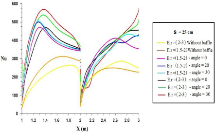 Figure 10. Local Nusselt number along the lower heated wall at (S = 25 cm) for different expansion ratios and baffle angles