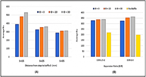 Figure 11 demonstrates a comparison of average Nusselt numbers for all configurations. The influence of baffle location at different baffle angles is highlighted in Figure 11(A). The comparison shows that the air jet has a slight effect on average Nu for cases with a baffle distance of more than 15 cm because of the increased cross-sectional area between corners and baffle edges. Moreover, the average Nu is rather unaffected by an increase in baffle angle to more than 20° for the same previous reason. By contrast, the baffle angle considerably influences the average Nu at S = 15 mm because of the jet effect of air flow. Figure 11(B) shows the effect of ER for the cases without and with a baffle at different angles. The average Nu is greatly improved with the addition of baffles owing to vortex formation, whilst it is slightly affected by the increase in angle because of the enlarged distance between step corners and baffle edges. Furthermore, the figure demonstrates increased average Nu with increasing ER. This result can be attributed to the larger size and intensity of vortices shown in Figure 7, as previously explained in the related section.