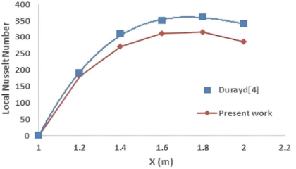 The simulated model is validated through comparison with a previous work [8], which was conducted under approximating conditions. The basic parameter used for comparison is the local Nusselt number along the duct length (X). Figure 12 compares the results from the present study and the previous work for ER = 2 without baffles. This comparison indicates good agreement with an error range between 5.8% and 12.3%. The variance between the results can be ascribed to the test conditions that affect the flow performance, such as air flow rate and applied heat flux. The increase in the difference between the symmetrical results with increasing distance X is attributed to the cumulative effect of the dissimilarity of some operating conditions.