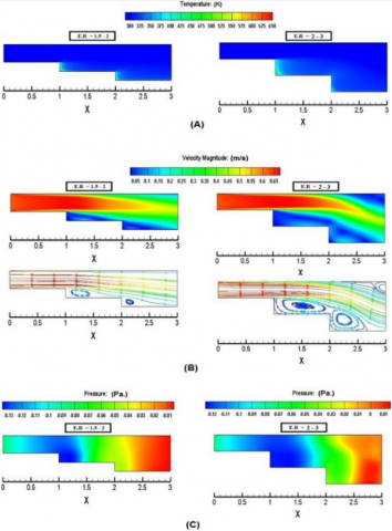 The numerical results in Figure 2(A) are obtained in a duct configuration without a baffle. The surface temperatures at the corner of the SE duct are high because of air secondary recirculation, which has low velocity at the corner of the SE zone. The air temperature decreases as the step height increases because the air flow becomes steady and uniform. Increasing the ER may extend the recirculation region, resulting in less heat transfer between the heated surface and air. As shown in the figure, at ER = 2-3, when the step height increases, the variation in fluid temperature extends along the step length owing to large recirculation and separation that reduce the local heat transfer intensity.