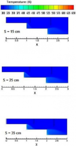 4. The temperature distribution of air demonstrates that the best distance (S) is 15 cm. This finding is explained through the velocity streamline, in which setting S = 15 cm increases the size and intensity of vortices. On the contrary, these vortices are larger but with less intensity when S = 25 cm.