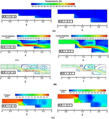 Figure 7 shows the performance of the air flow of the double-stepped SE duct for baffle angle θ = 0° and S = 25 cm for two ERs = 1.5-2, 2-3. The temperature distributions for both ER have similar patterns, whilst the heat transfer and temperature gradients at both step corners are greater at ER = 1.5-2. The pressure drop is higher at ER = 2-3 because of the considerable change in the cross-sectional area. A negative-pressure region at recirculation zones is identified downstream of the baffles and at the second corner. The velocity distribution at ER = 1.5-2 illustrates that the recirculation zone occupies the whole area between the two baffles; at ER = 2-3, the vortex becomes smaller, and a secondary recirculation zone appears behind the first baffle.