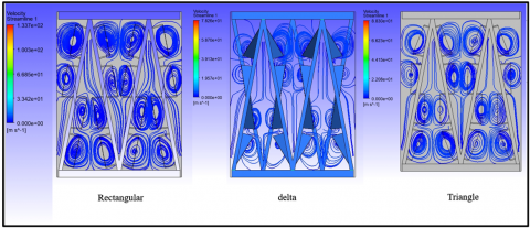 No-slip on VG surfaces captures flow separation and longitudinal vortex formation, which intensifies near-wall mixing and disrupts thermal boundary layers [12-14]. This detailed capture of vortical structures is critical to predict the enhanced heat-transfer mechanisms induced by each VG shape.