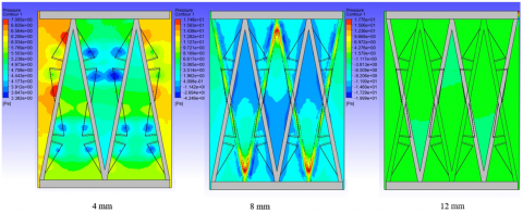 Figure 22. 2D pressure front view of triangular VGX mounted on OT fins through various locations (4, 8, and 12) mm