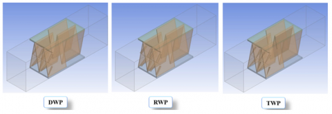 In previous work, a compression has been done for various promising plate fins, including plain fins and offset fins with various shapes (rectangular, triangular, and mixed of both) [10]. To inspect their thermohydraulic features. All offset fin geometries showed an augmentation in thermal properties like Nu compared to the plain ones. A plate-fin heat exchanger (PFHE) equipped with OTF was selected due to its demonstrated 20.32% enhancement in Nusselt number over plain fins (Figure 1) [10]. Three vortex-generator (VG) arrangements, rectangular winglet pair (RWP), delta winglet pair (DWP), and TWP are mounted on the OTF surfaces in a CFU pattern at a 45° attack angle.