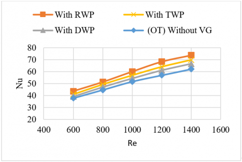 Further examination revealed that the RWP design had the greatest thermal increase, with a mean Nusselt number (Nu) of 75. This was much better than the TWP and DWP arrangements, which averaged 70 and 65 Nu values. It's possible that RWP's superior performance is due to the fact that it has the ability to generate powerful and coherent vortices that have a persistent swirl core that extends downstream. It is because of this core that greater mixing and heat transfer are promoted, which ultimately results in improved performance.