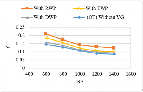 Figure 7. Effect of Reynold number with various types of vortex generator of (β = 45°, Vh = 1.25 mm, VL = 0.5 mm) on the friction factor