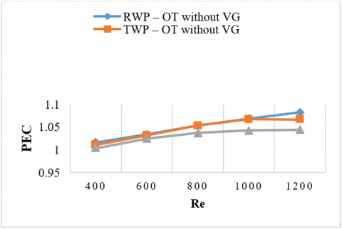 RWP again led in performance efficiency, as measured by the PEC, with a maximum PEC of 1.08, indicating a good heat transmission-pressure drop balance. The DWP had the lowest PEC, 1.04, reflecting its low thermal benefit over hydraulic cost.