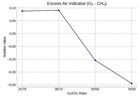 Figure 13. Excess Air Indicator (O₂ – CH₄) vs O₂/CO₂ ratio