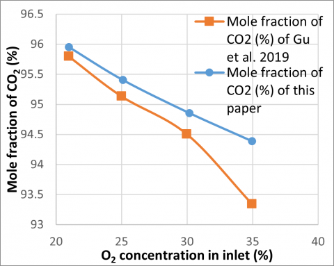 Figure 14. Mole fraction of CO2 with O2 concentration in the inlet of validation