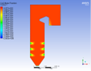 Figure 3 depicts the change in the flame temperature according to the varying proportions of O2 - CO2 in an oxy-fuel combustion system. The flame temperature initializes to a value of about 2305 K, as shown when 21/79 O2/CO2 was used as a representative of combustion under air-like conditions. When the oxygen ratio is increased up to 30/70, the flame temperature increases sharply to the maximum at 2656 K, which represents higher combustion efficiency due to the availability of the oxidizer. Nevertheless, there is a sharp decrease in temperature to 1822 K when the ratio of oxygen is further increased to 50/50, which can be explained by greater CO2 dilution and loss of radiative heat. At the ratio of 70/30, the lowest temperature of only 1377 K was recorded with the excess quantity of oxygen, causing an unstable nature of the flames and a greater thermal diffusion. On a physical level, the trend shows that there is a non-linear connection between the thermal output and the oxygen enrichment. Hugely oxygen-enriched gases result in cooling effects and unstable combustion, whereas moderate oxygen enrichment enhances combustion. This shows why the oxidizer ratio should be carefully tuned to keep the flame temperature high and still not interfere with burner stability and burner material safety.