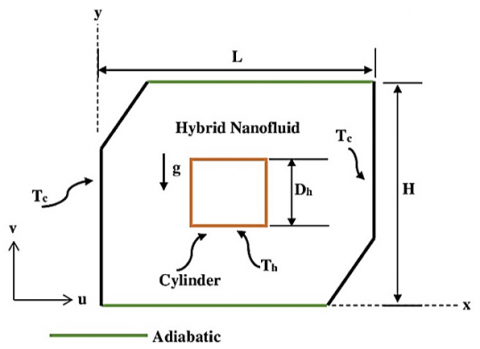 Figure 1 shows a numerical model for studying the heat transfer by natural convection and the flow of a hybrid nanofluid (Mg + SWCNT / Water) inside a closed chamber square cavity (L = H = 1 m) filled with this fluid. The left and right walls of the cavity are exposed to a cold temperature (Tc = 300 K), while the upper and lower walls are thermally insulated, which prevents heat transfer through them. A cylinder is inserted into the center of the cavity, and this cylinder can take various shapes, such as square, circular, oval, or rhombus, and be heated with constant heat, that is, its inner walls are considered a source of heat. The downward direction of gravity g affects the fluid flow inside the cavity, creating natural convection currents that depend on the thermal differences between the heated cylinder and the cooled walls. In this model, the thermal distribution is analyzed, and flow lines are formed to study the efficiency of heat transfer using a hybrid nanofluid.