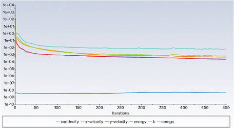 Figure 4 represents the evolution of the residual values of the governing equations during several iterations up to 500 steps, which reflects the closeness and stability of the numerical solution in the turbulent normal load model inside a square cavity containing a cylinder of various geometric shapes. The k-omega model was used to calculate the turbulence in the flow, and operating conditions were adopted at high Rayleigh numbers, which shows the influence of normal load strongly on the fluid flow. It can be noted that all the remaining values decrease significantly during the first 100 repetitions, which indicates a rapid response of the numerical system towards equilibrium. As the iterations continue, the values begin to stabilize at low levels, with most of them stabilizing in the range between 10-3 to 10-5, which is acceptable in turbulent flow studies. The velocity equation in the x-direction shows good convergence until it reaches the limits of 10-9, which indicates a high accuracy in solving the velocity components. The fact that the residuals remain within the limits of stability without significant fluctuations indicates that the numerical solution has reached the stage of stability and numerical convergence, which is a prerequisite for ensuring the reliability of the results extracted from the study.