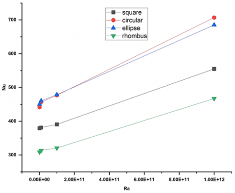 Figure 5. Variation of Nusselt number with Rayleigh numbers for different cylindrical shapes inside a closed square cavity