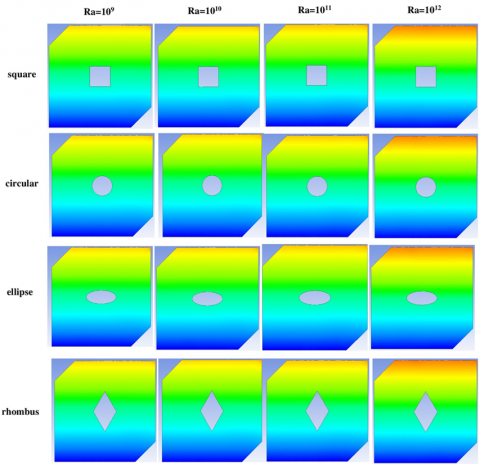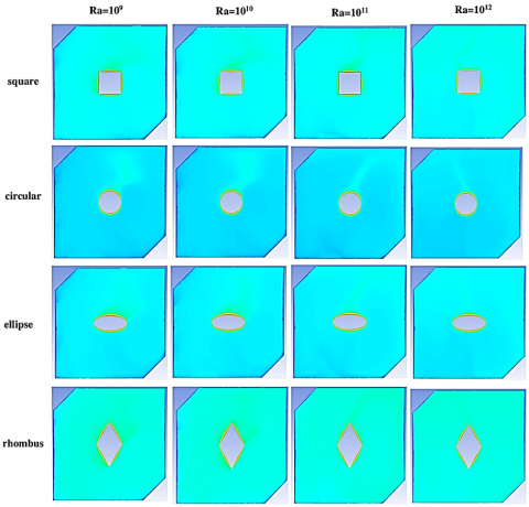 Figures 6–8 represent the temperature distribution, streamlines, and pressure distribution inside a closed square cavity containing various cylindrical shapes (square, circular, oval, and rhombic), at different Rayleigh numbers (Ra = 109 to 1012). We can see from the temperature maps (Figure 6) that heat transfer by natural convection increases with increasing Rayleigh number. The temperature gradient changes from a linear distribution at Ra = 109 to a more complex, nonlinear distribution at Ra = 1012, indicating a transition from uniform natural convection to turbulent natural convection. Rhombic and elliptical objects exhibit steeper temperature gradients at higher numbers, indicating that they contribute more to convection than other shapes, especially the rhombic shape at Ra = 1012. The streamlines (Figure 7) demonstrate the development of vortices within the cavity as the Rayleigh number increases. At Ra = 109, the streamlines are relatively simple and symmetrical. However, at Ra = 1012, several secondary vortices and complex flow regions appear, particularly around sharp-angled objects such as diamonds, demonstrating the effect of shape on internal flow redistribution. The circular shape exhibits less turbulent streamlines than other shapes, indicating less flow resistance. Finally, the pressure map (Figure 8) shows that pressure differences within the cavity increase with Rayleigh number, with high- and low-pressure regions increasing, particularly at the upper and lower walls. The effect of shape is very clear. For example, the square and diamond shapes exhibit a more asymmetric and high-pressure distribution at Ra = 1012, indicating stronger driving forces affecting convection currents within the cavity. Accordingly, the geometric shape of the internal body within the cavity greatly affects the natural convection characteristics, as sharp corners (as in the rhomboid shape) enhance internal vortices and increase heat transfer, especially at large Rayleigh numbers, providing an important engineering guide to improve the efficiency of natural convection cooling systems using appropriate internal shapes.