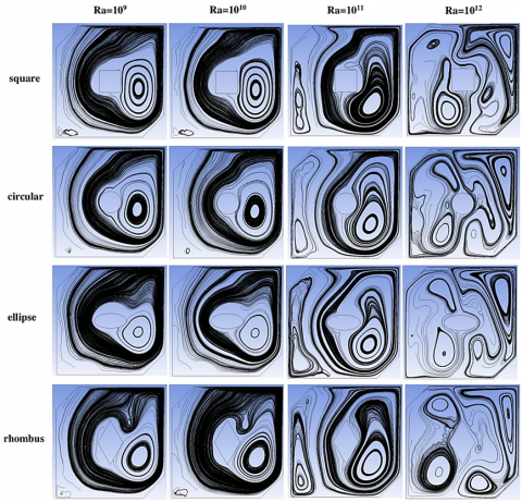 Figure 5 represents the relation of the Nusselt number (Nu) to the Rayleigh number (Ra) of four different shapes of cylinders (square, circular, ellipse, rhombus) placed inside a closed square cavity. It can be seen that the Nusselt number increases with an increase in the Rayleigh number for all forms, reflecting the improvement of heat transfer by natural convection with increasing convection forces. It can be seen that a circular cylinder achieves the highest values of the Nusselt number at all Rayleigh values, followed by an ellipse, then a square, and finally a rhombus that achieves the lowest thermal performance. These results can be explained by the effect of the cylinder shape on the air flow inside the cavity, where the circular cylinder allows a smoother flow of fluid around it, which leads to enhanced heat transfer and reduced flow resistance, thereby increasing the number of Nusselt. The elliptical cylinder, although flattened, retains an acceptable flowability, which allows good heat transfer, albeit less than the round cylinder. As well as a square cylinder, it has sharp corners that cause a disturbance in the air flow and localized stagnation, which relatively impairs heat transfer. Finally, the rhomboid cylinder (diamond-shaped) leads to maximum turbulence of the flow and the formation of large stagnation zones, which reduces the efficiency of heat transfer and leads to the lowest values of the Nusselt number. Thus, an increase in the Rayleigh number means an increase in the convection effect, and the more streamlined the shape of the cylinder (like a circle), the better this effect can be exploited, which leads to an increase in the Nusselt number and improved thermal performance.