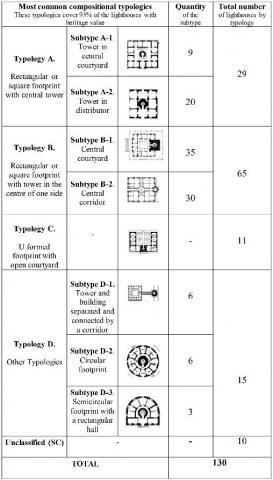 Nowadays, due to current technological advances, lighthouses have lost part of the functions assigned to them. For this reason, a large number of projects are being developed today to include tourist uses in the lighthouses. However, it has been detected that most of these projects eliminate a wide range of tangible and intangible valuable elements, causing the distortion of their value as Industrial Heritage [12]. For this reason, in 2017, it was developed the Catalogue of Spanish lighthouses with Heritage Value, for the Institute of Cultural Heritage of Spain [13]. In total, 130 lighthouses were catalogued, which were classified in different typologies [14], according to their volumetry, technology and spatial distribution (Figure 1).