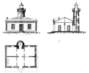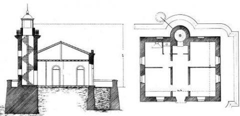 Several reports of this period detailed some characteristics of the original construction and the technology used. According to drawings made in 1867 [23], the original lighthouse was composed of two parts: the lighting tower and an adjacent building. The tower, which still stands, was erected on circular plan, semi-embedded on the centre of north-facing façade (Figure 3). It has a height of 8.50 m above the ground level and 53 m above the mean sea level. The adjacent building was planned on one single floor, 4.25 m high, with a hipped roof and rectangular ground plan of 10.70 x 8.70 m2.