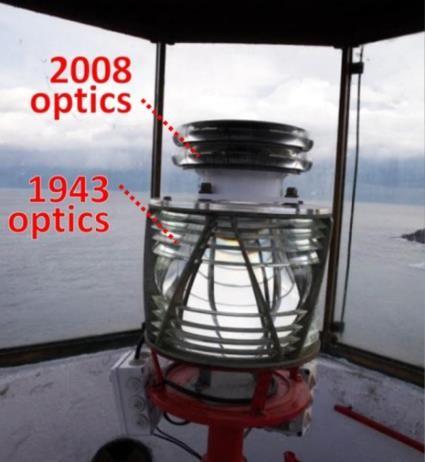 Several decades later, in 1942, the electrification of the lighthouse was carried out. In 1943, the optics was also replaced (Figure 6). This second optics worked with a lamp of compressed acetylene dissolved in acetone. Nowadays, this optics is still kept in the lighthouse as reserve of a new one, which was implemented in 2008. The new optics works with LED lamps, generating flashes with no rotation mechanism.
