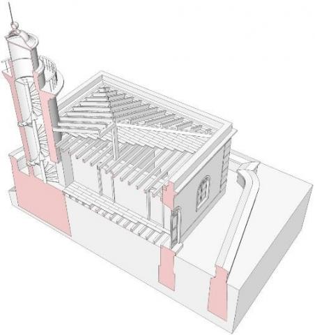 The historical-constructive study has served to identify and to analyse the original architectural, structural and technological elements of the lighthouse of Santa Clara Island. Following the results of this study and the graphic documentation of 1867, a virtual reconstruction of the original building has been elaborated (Figure 8). The 3D model was made using AutoCAD. The model was exported to SketchUp in order to manipulate and render it.